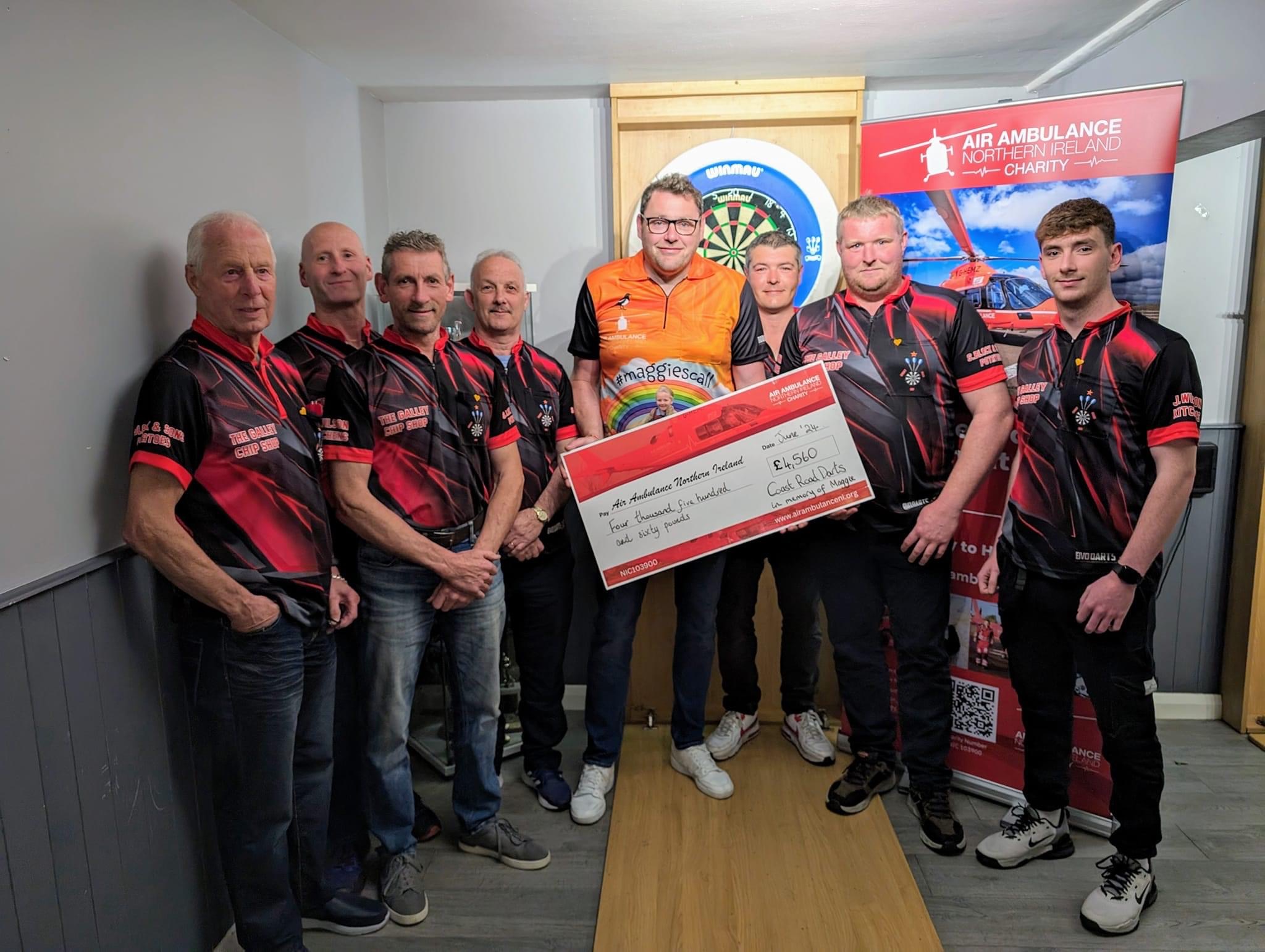 The Coast Road Darts Team in Glenarm have fundraised £5,100 for Air Ambulance NI Charity in memory of Maggie Black who passed away almost 4 years ago from undiagnosed Addison’s Disease.