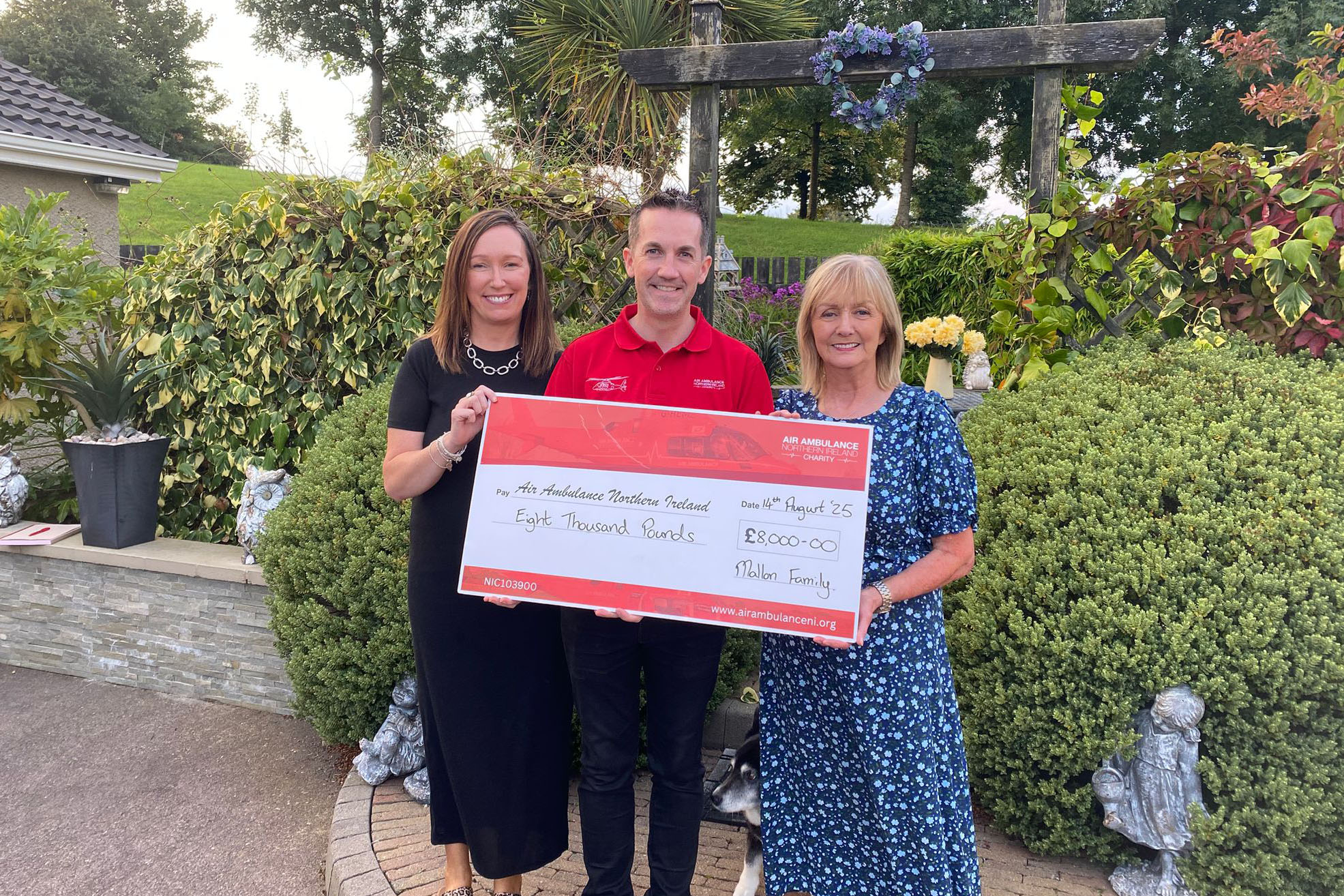 Kate Mallon and her daughter Tina present Damien McAnespie, Air Ambulance NI fundraising manager, a donation of £8000 in memory of Brendan Mallon, Ballygawley who sadly passed away in January 2024.