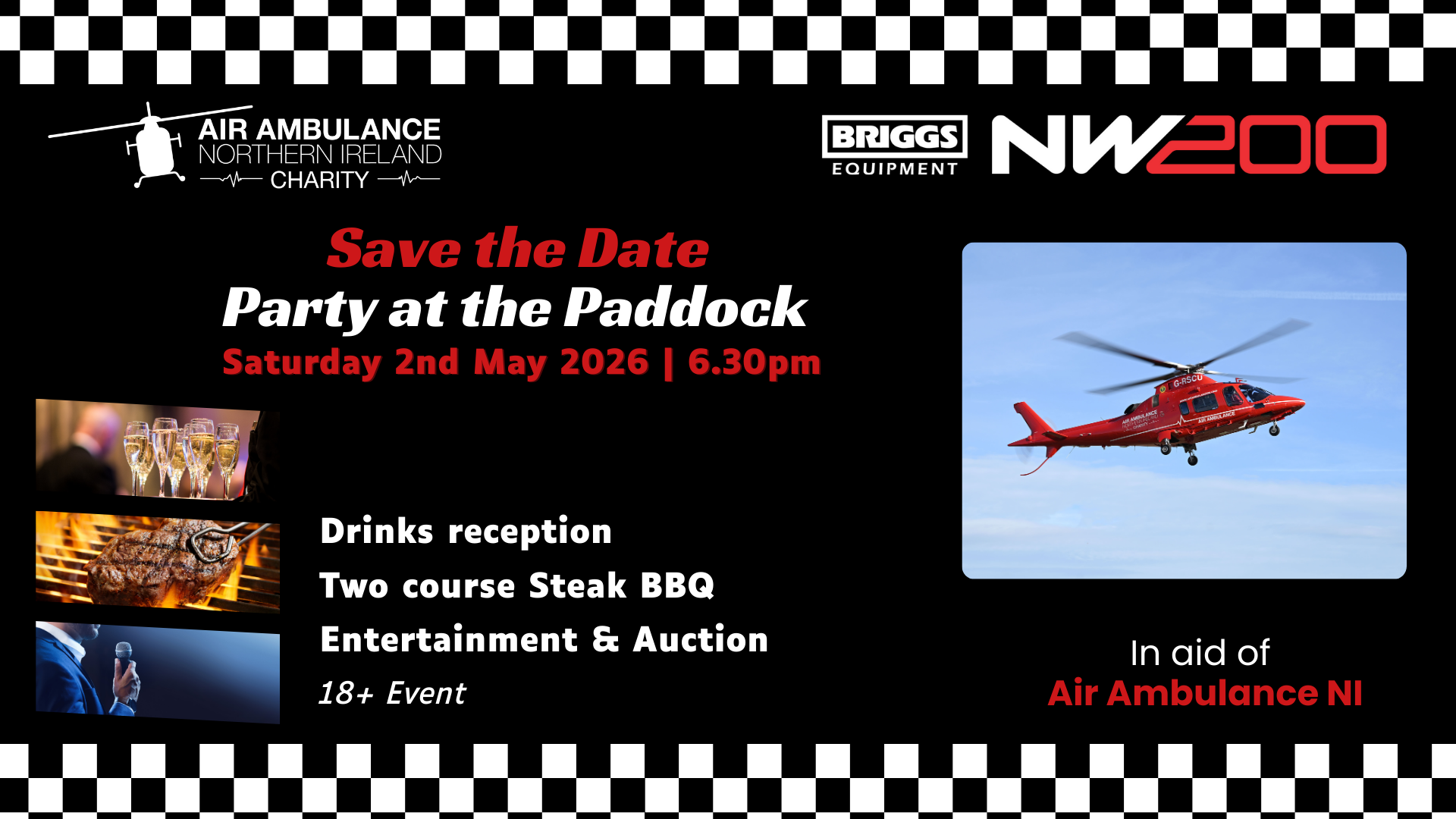 This exciting evening will bring together supporters for a night of delicious food, fantastic entertainment, and a chance to win exclusive prizes. The event will be held in the NW200 marquee and will feature a drinks reception, a two-course steak BBQ, and an auction with a variety of fantastic items.
